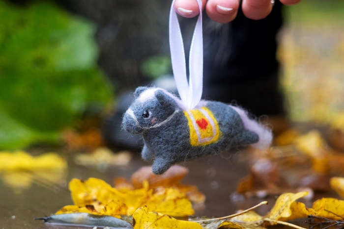 Лис со снежинкой на носу, слеплен из полимерной глины. Это брошь,