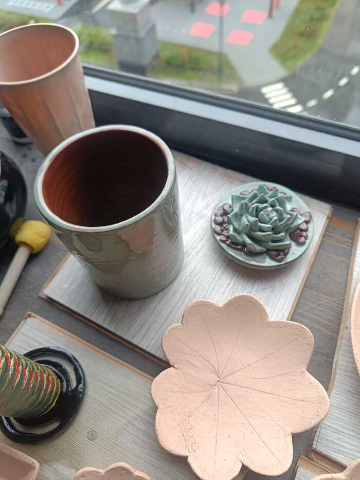 Возвращаемся к изделию. Баночка сделана из высокотемпературной красной глины и покрыта однотонной высокотемпературной глазурью двух цветов (вторая на камушки керамзита). Каждый лепесточек, камушек вылеплен вручную вот этими вот ручками. Конечно, если такие изделия ставить на поток, то целесообразно сделать гипсовые формы, ну или хотя бы силиконовые/пластиковые.