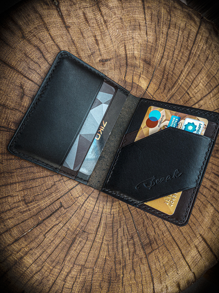 Условия: три отдела для карт; вместительный карман для мелочи; скрытый отдел. Цвет чёрный, кожа мягкая.