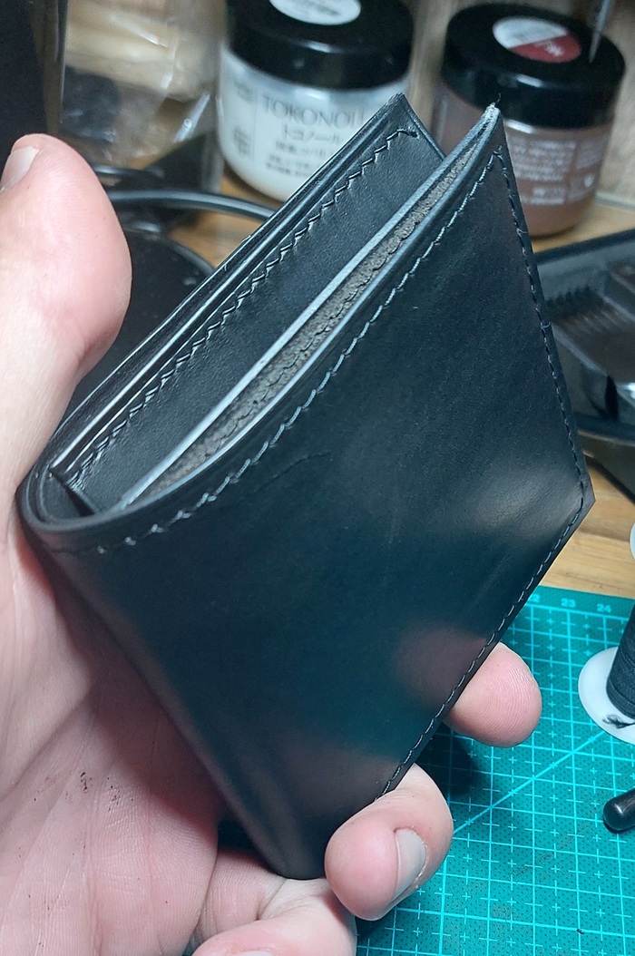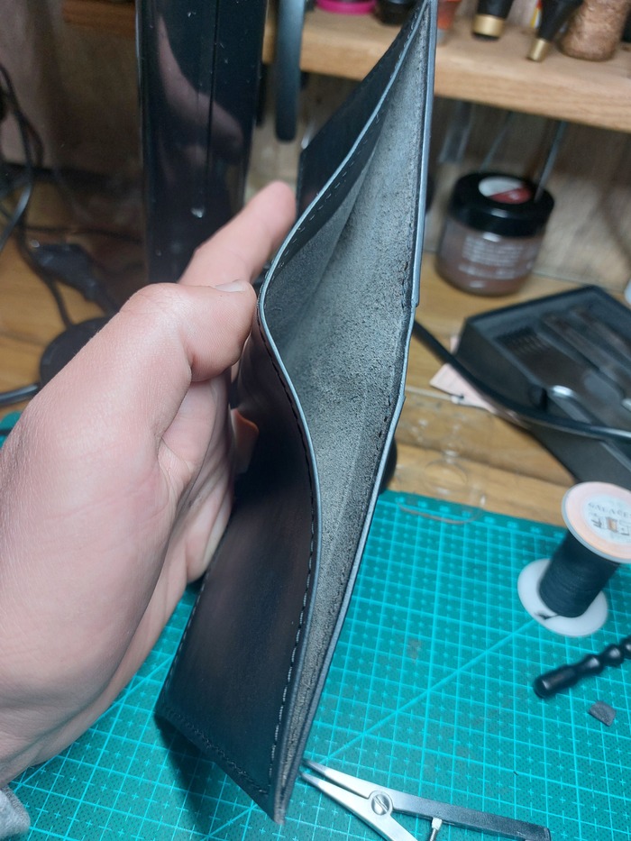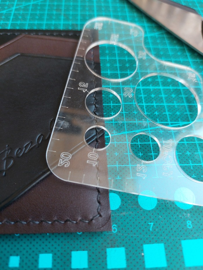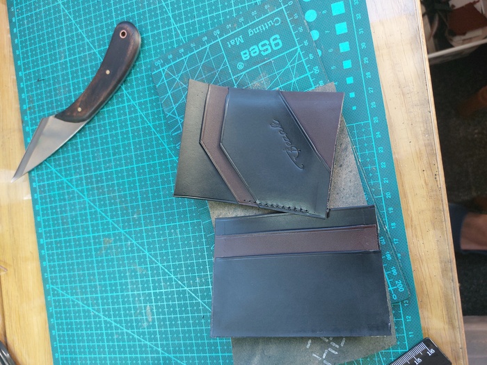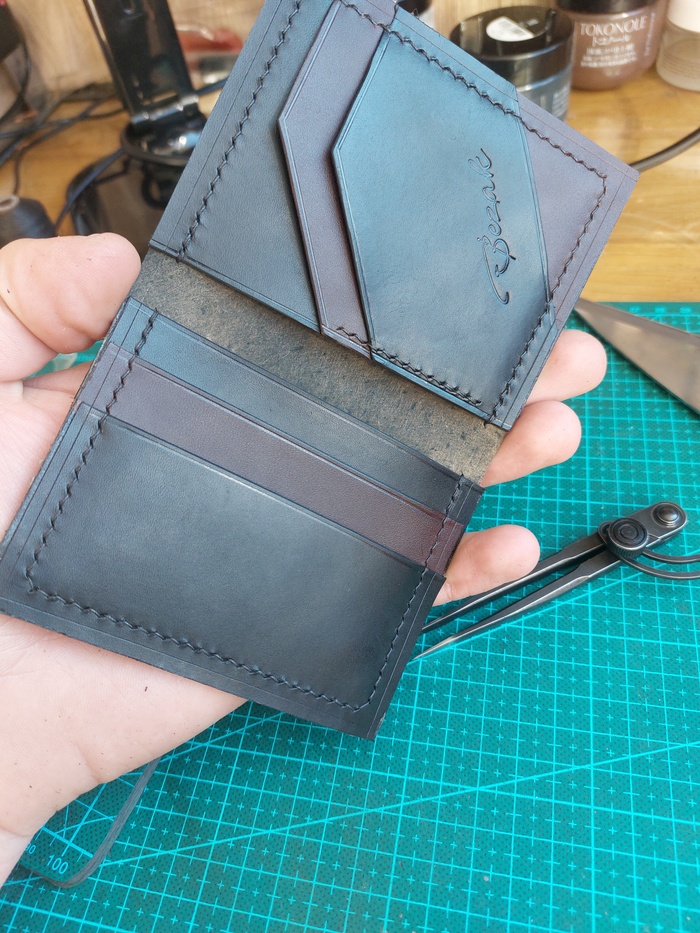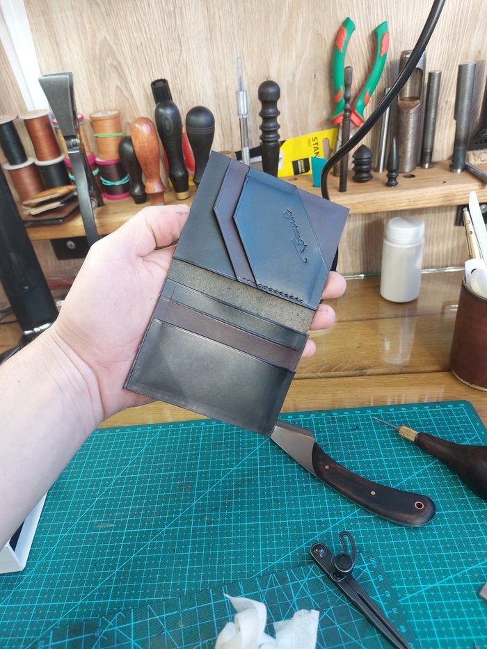 Осталось дело за малым- закруглить углы, нанести биговку, заполировать торцы. После этого покрываю портмоне бальзамом для кожи