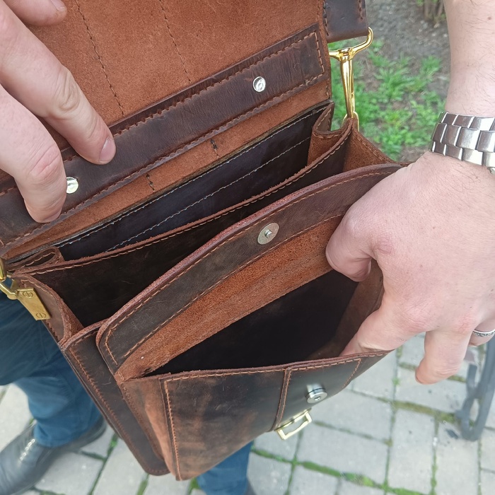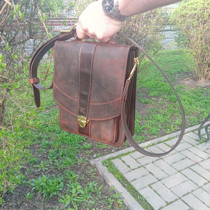 Материал натуральная кожа крейзи хорс шоколад, толщина 1,6-1,8 мм., передняя и задняя стенка усилена вторым слоем,нить крученая 0.6 мм., шаг пробоя 5 мм., фурнитура латунь, под верхнюю ручку клапан усилен снизу металлической линейкой в 2 слоя.