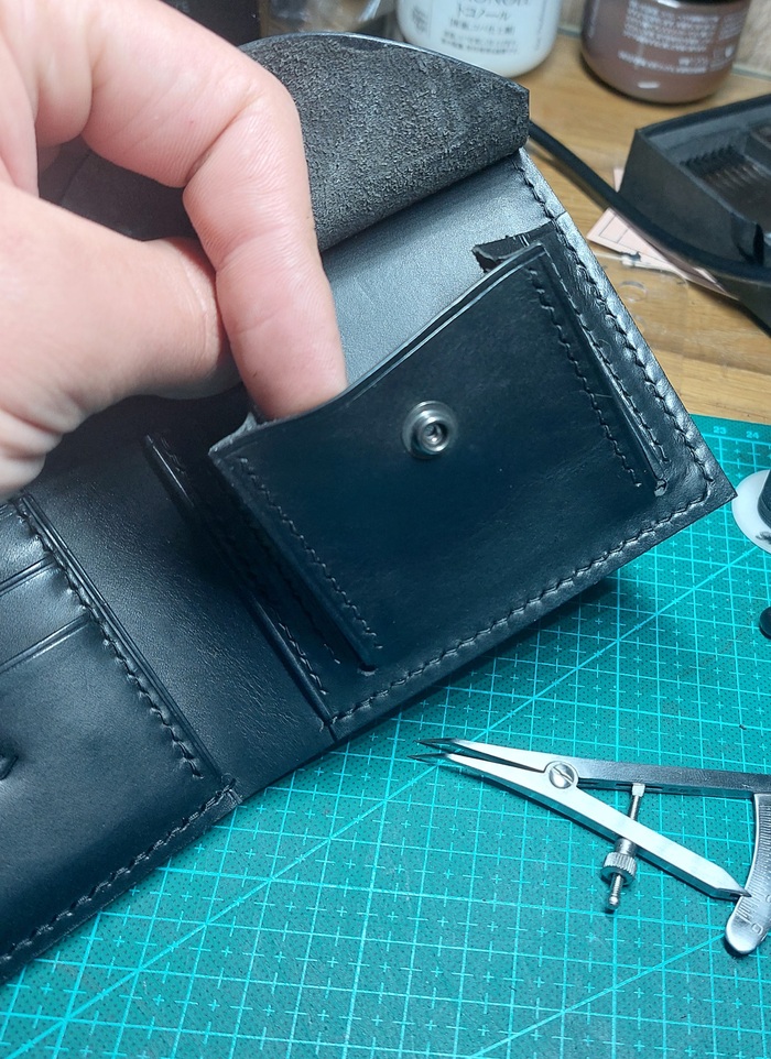 Затем я приклеиваю их к основной внутренней детали, вырезаю и приклеиваю карман для монетницы, по месту ставлю кнопку на кармане