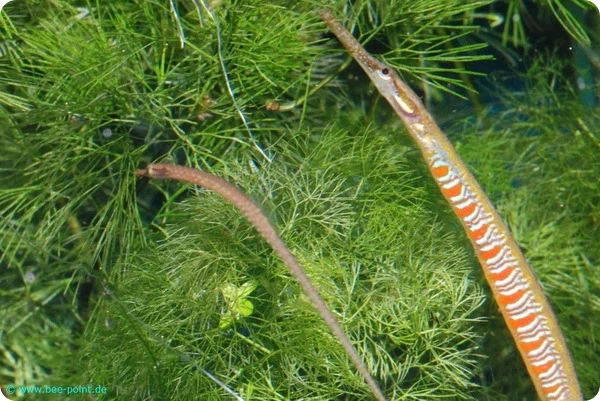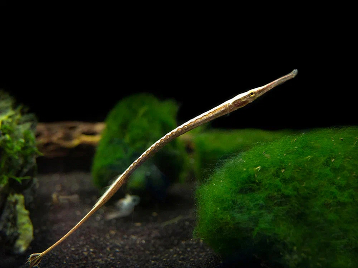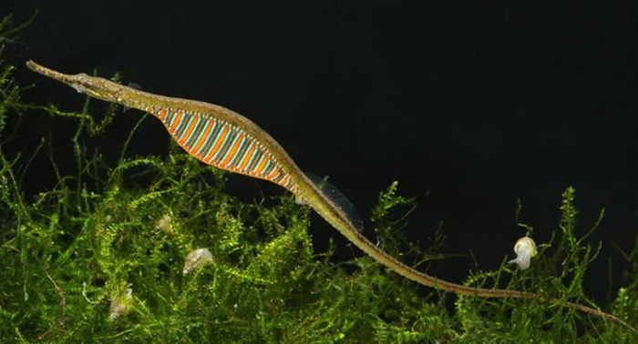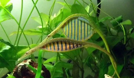 Радужная рыба-игла: Пресноводный родственник морского конька. Их самцы раздувают пузо и вынашивают детёнышей вместо дам