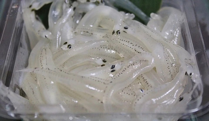 Попалась мне эта диковинка совершенно случайно - на субботнем рынке у рыбного прилавка стояли два пенопластовых контейнера с искрящейся на солнце студенистой массой с выраженным рыбным или, скорее, морским ароматом. По отдельности каждая рыбка практически полностью прозрачна, за исключением точек-глаз. "Рыба-лапша", - отрекомендовал продавец.