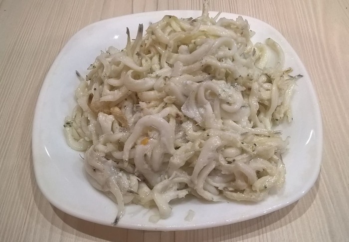 Если не знать, что это рыба, то готовое блюдо внешне напоминает тарелку лапши. Вкус тоже «лапшичный», с рыбным привкусом и едва заметной «сластинкой». Можно еще сбрызнуть соевым соусом. Я проверял - вкусно. При этом готовая рыбешка чуть похрустывает при пережевывании (нет, песка не было!), но никаких костей, даже самых мелких не ощущается. Блюдо очень сытное: купленные «на пробу» 300 граммов рыбы доедал с трудом. Похоже, что блюдо - чистый белок, от того так трудно съесть его много.