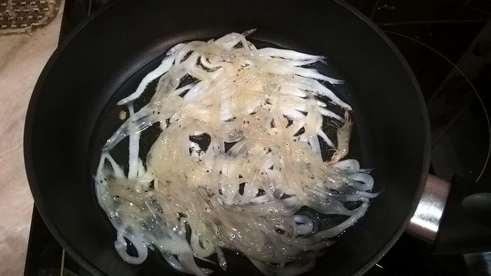 В процессе жарки рыба быстро теряет прозрачность, белеет и действительно становится похожа на домашнюю лапшу, нарезанную торопливой неумелой хозяйкой — кривовато и вразнобой.
