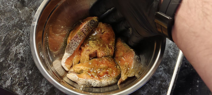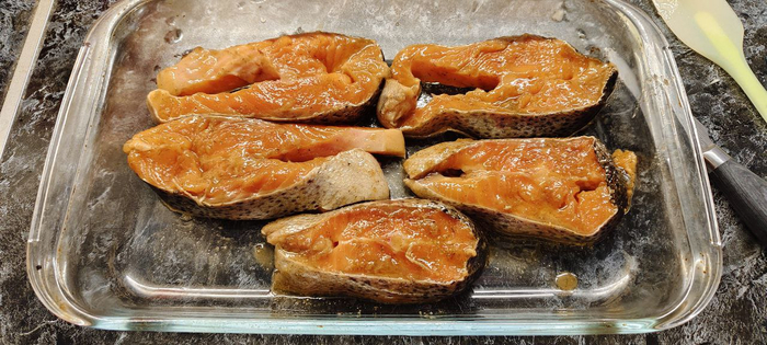 Рыбу мариную примерно 15 мину. Потом отправляю в разогретую духовку на 180 градусов на 20 минут