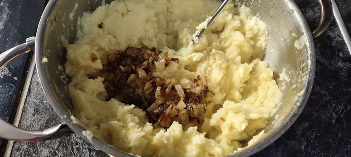 Делаю из картофеля пюре с добавлением масла и сливок. Всыпаю обжаренный лук