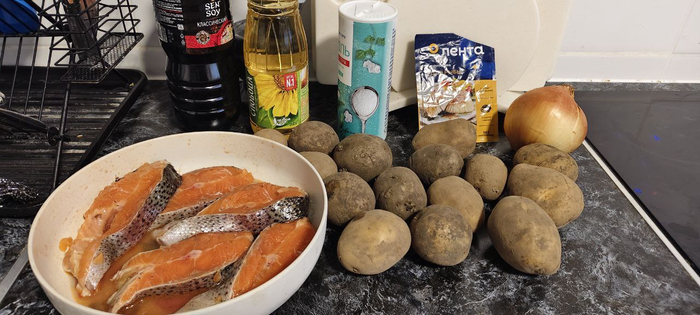Стейки форели у меня 5 шт, картофель 1,5 кг, лук крупный 1 шт, специи для рыбы ( смесь), соль, масло, соевый соус.