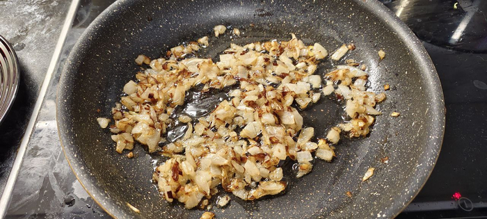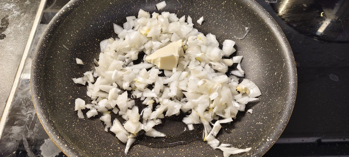 Лук нарезаю средним кубиком и обжариваю на смеси сливочного и растительного масла