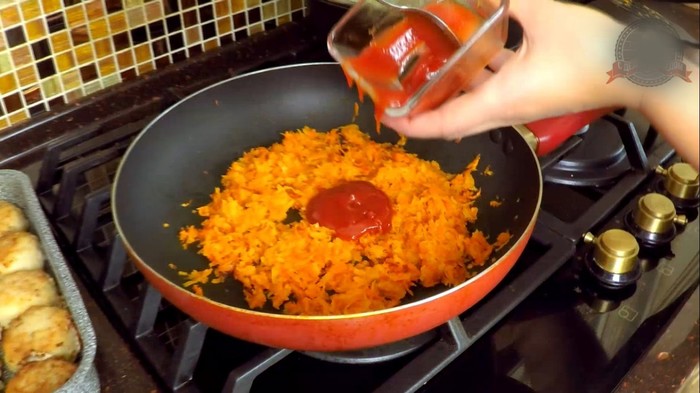 Морковь натереть на крупной терке. Пассировать на растительном масле 10-12 минут до мягкости. После чего добавить томатный кетчуп. По необходимости добавить пару ст.л. кипятка. Жарить еще 3-5 минут и выложить на рыбные шарики.