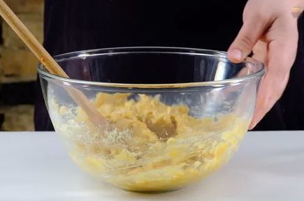 2) Влить 50 мл сливок, яйцо и перемешать массу.
