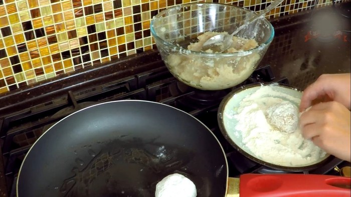 Захватить столовой ложкой фарш, мокрыми руками сформировать шарик. Обвалять каждый в пшеничной муке.