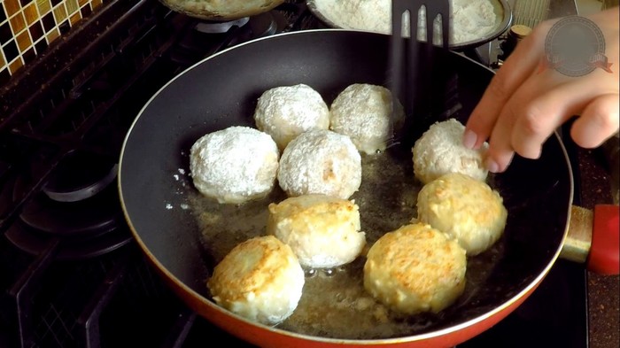 7) Выложить котлетки в раскаленное на сковороде масло и обжарить до золотистой корочки с двух сторон. Затем влить 70 мл горячей воды, убавить огонь и тушить котлетки до готовности.