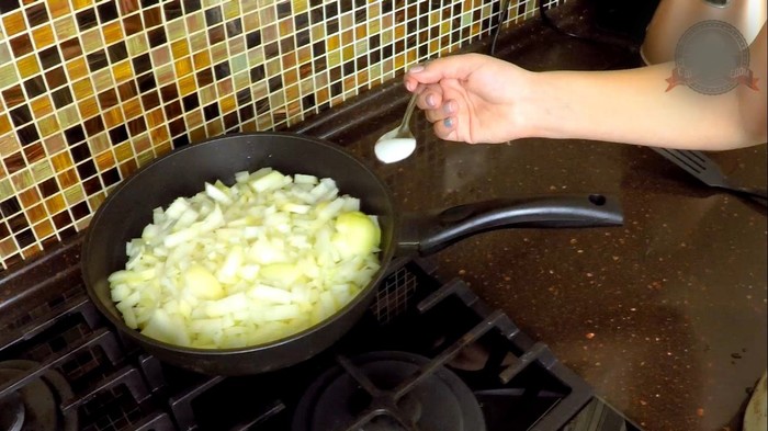 1) Мелко нарезанный лук обжарить на сковороде до золотистого цвета.