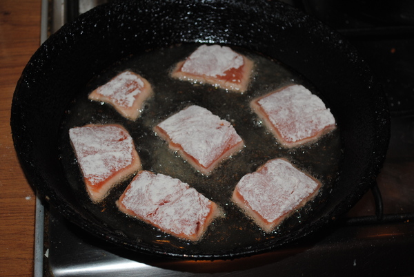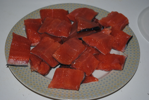 Филе посыпаем смесью 2/1 соль-сахар и даём постоять минут 20. После этого промываем холодной водой, обсушиваем и нарезаем на кусочки.