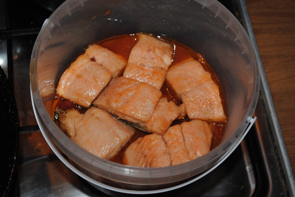 В ёмкость, где блюдо будет настаиваться выкладываем немного маринада, сверху слой рыбы, опять маринад итд.