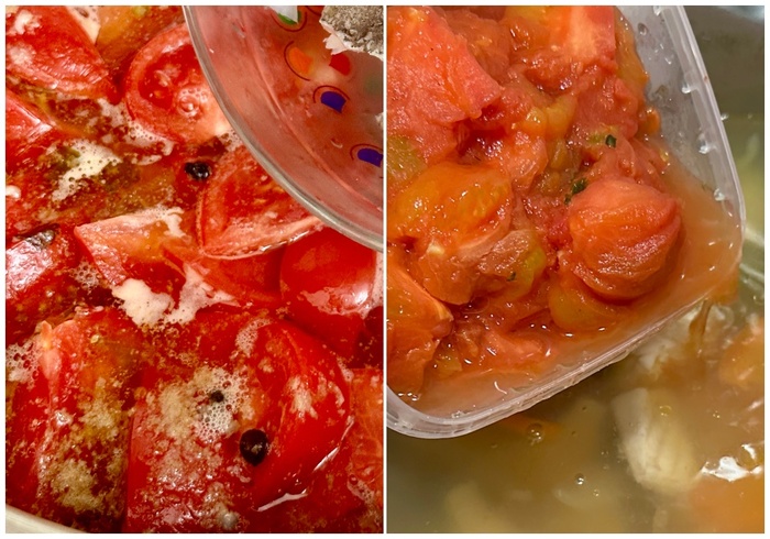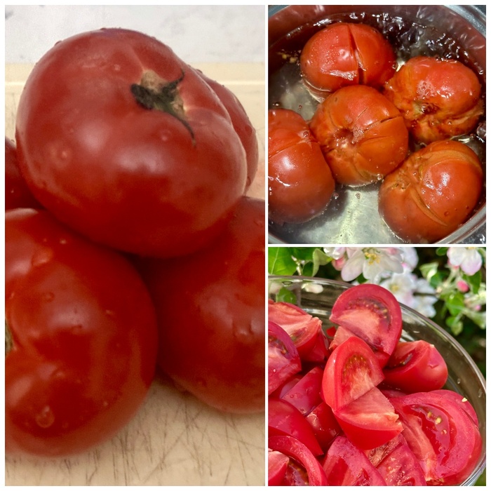 Как приготовить помидоры для закладки в кастрюлю – дело вкуса. Можно просто крупно нарезать. Можно ошпарить и очистить. Я делал и так и этак.