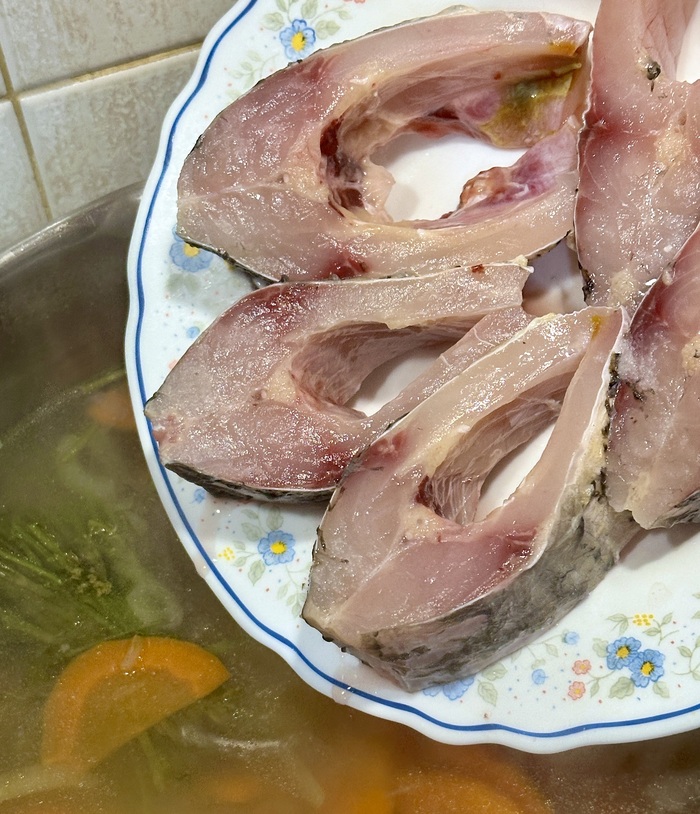 Самого сазана нарезал крупными кусками. Слегка присолил и убрал в холодильник.