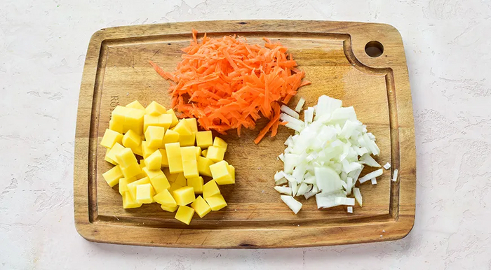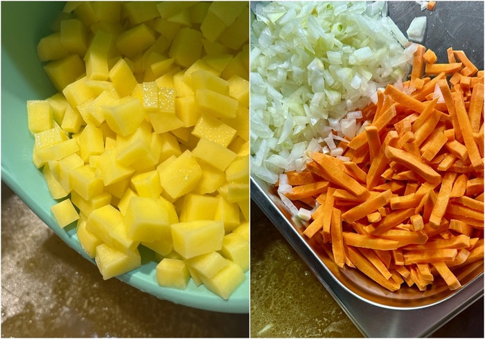 В отличии от аутентичного «ростовского» рецепта пяток картофелин почистил и порезал некрупно, так чтобы в ложку умещалось. Морковку и головку лука небольшую. Морковку – кружочками, лук – пёрышками.