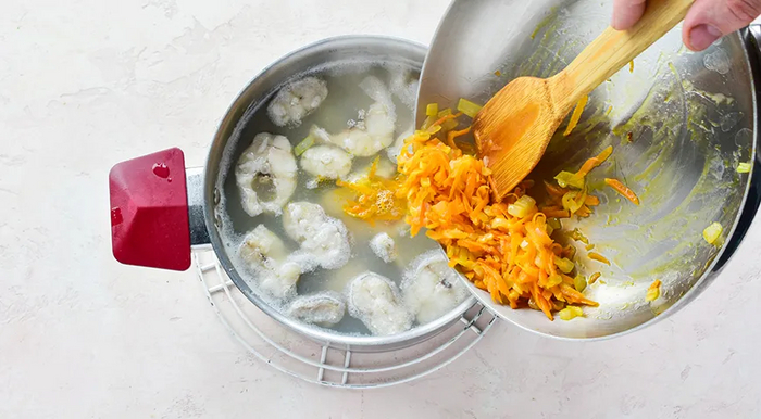 И минут через пяток после рыбы в кастрюлю их отправил.