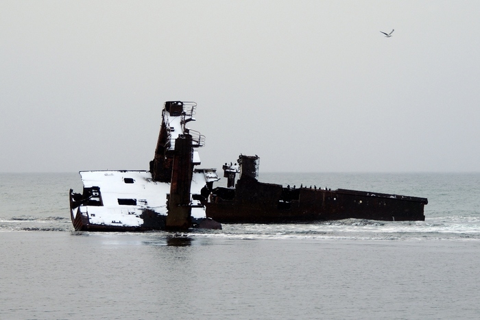 Остов находится в Татарском проливе, в районе Калинино (Сахалинская область, Холмский район)