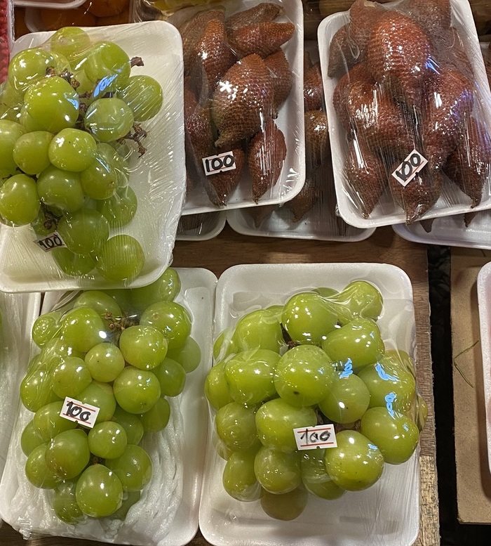 Виноград, большой и без косточек, сладкий 100 бат ≈ 294 руб (на наш взгляд около 600 гр) Змеиный фрукт 100 бат ≈ 294 руб