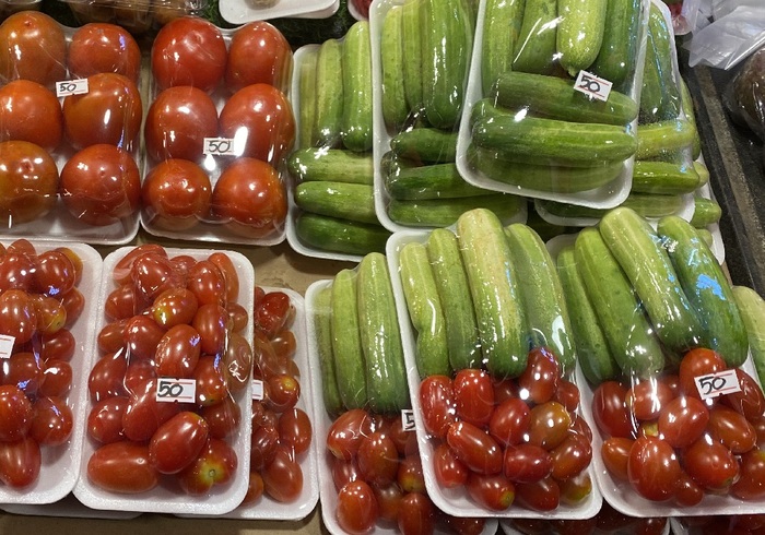 Томаты, лучше, чем в местных супермаркетах, взвешивали50 бат ≈ 147 руб за 700 гр Огурцы 50 бат ≈ 147 руб (так же около 700гр) Томаты черри 50 бат ≈ 147 руб (на взгляд 300 грамм)