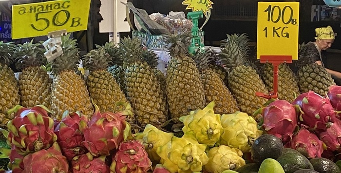 Ананас 50 бат ≈ 147 руб за 1 шт Питайя (Драконий фрукт) 100 бат ≈ 294 руб за 1кг, покупали 1 шт, нам сразу ее нарезали, фрукт понравился