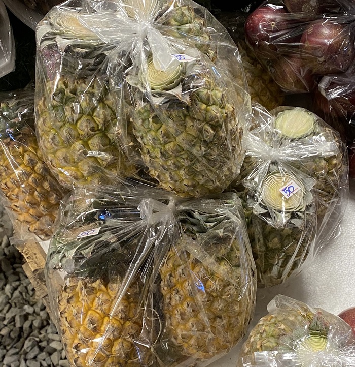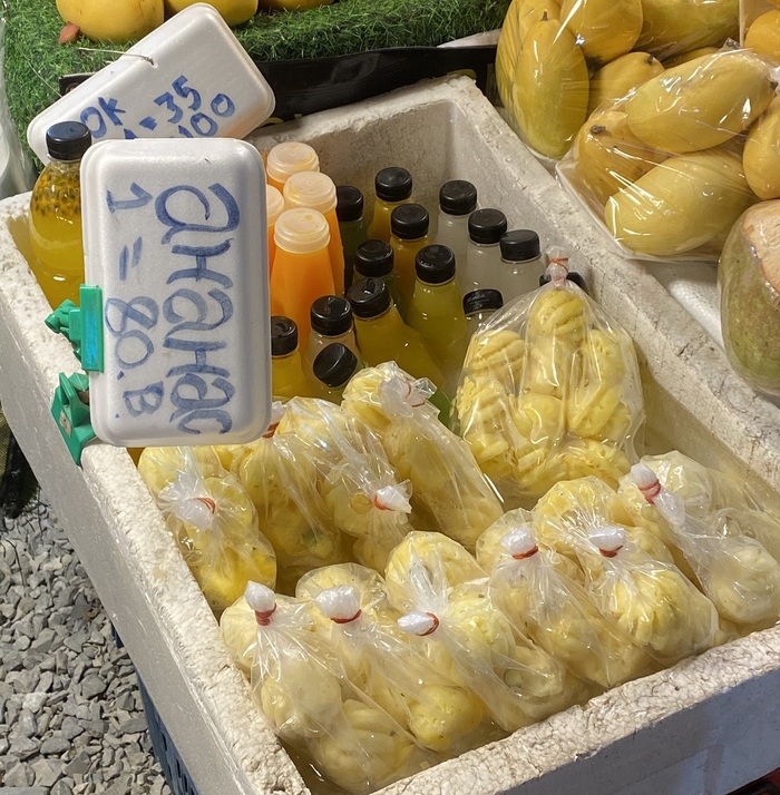 Три небольших ананаса в одном комплекте 50 бат ≈ 147 руб. Ананасы покупали разные, всегда были сладкие, не кислые.