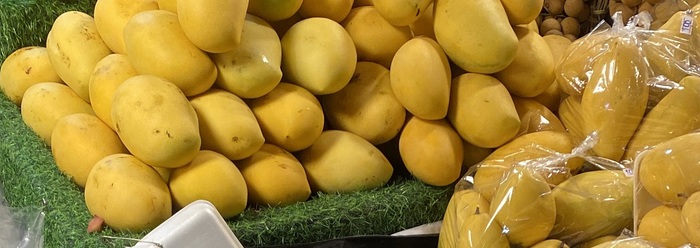 Манго, сочное, мы купили 2шт, на развес не было ценника на прилавке, вышло 50 бат ≈ 147 руб за 800 гр Манго почти везде на прилавках продают пакетами по 7-8шт, 100 бат ≈ 294 руб (около 3кг)