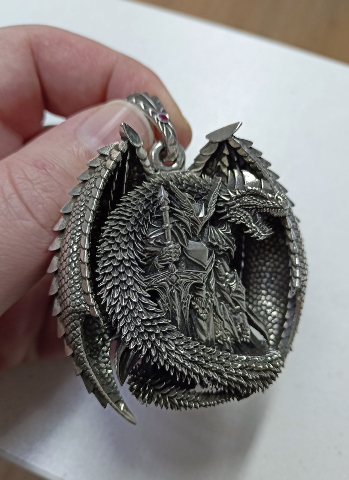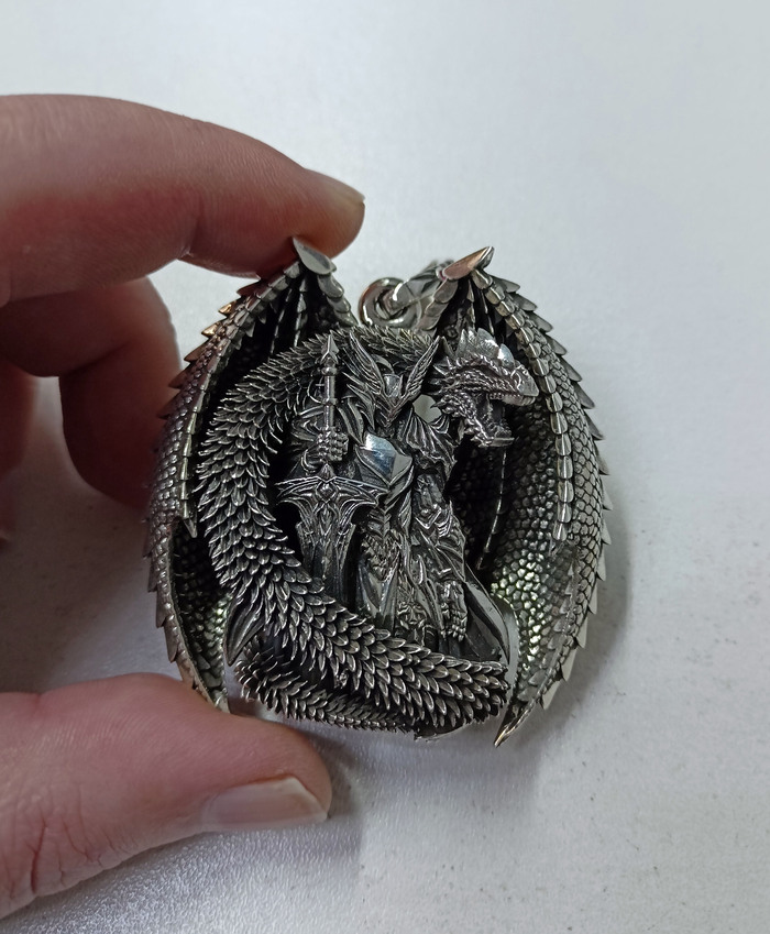 Здравствуйте . Закончил очередной Проект Кулон "Серебряный Меч Дракона" . Материал Серебро 925 пробы . Вес примерно 100 грамм . Размер 65 мм .