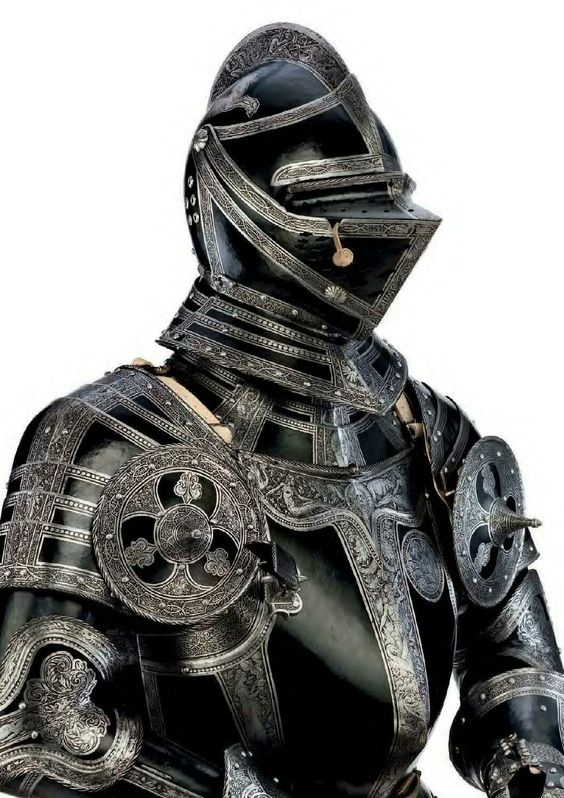 Это был один из лидеров протестантов в Северной Германии. Два комплекта, изготовлены в 1563-1565 годах. Каждый весит 28-30 кг.Обратите внимание на шлем. Многочисленные отверстия в форме буквы X обеспечивают хороший обзор и воздухопроницаемость даже при опущенном забрале. Справа на черных доспехах есть «arrêt de cuirasse» или «упор для копья».