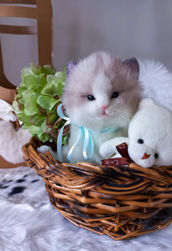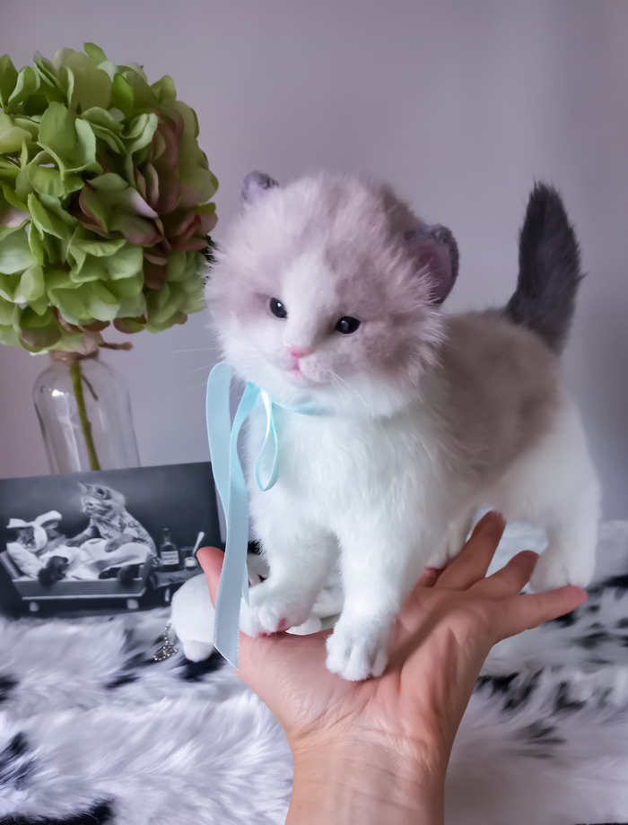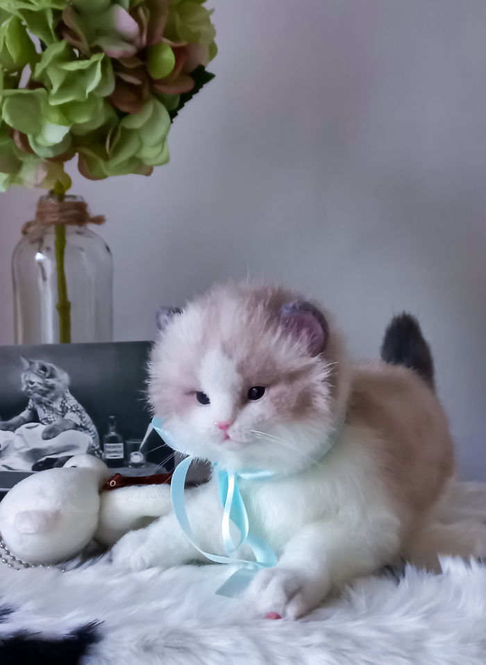 Нежная и игривая девочка цвета слоновой кости, а лапки, хвост, ушки и моська пепельные. Глаза - небесно-сине-голубые, яркие.