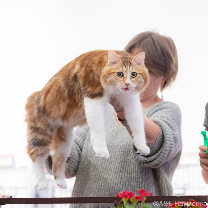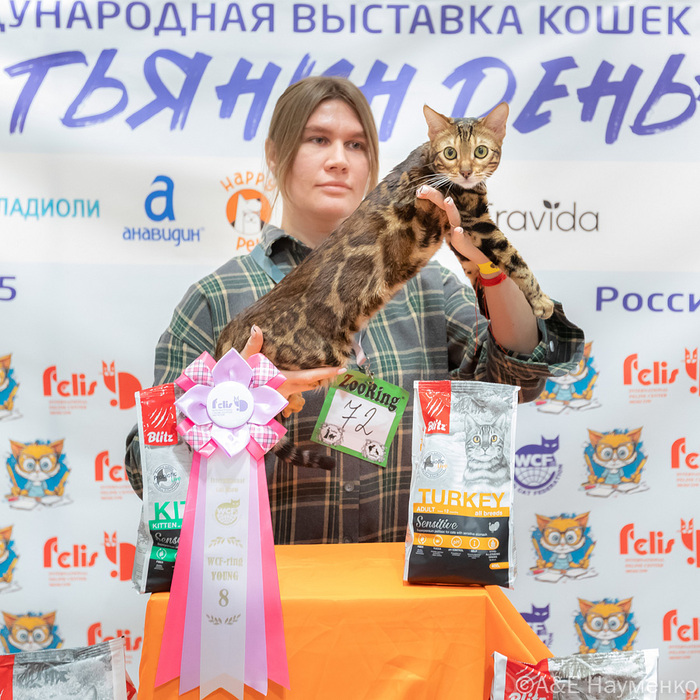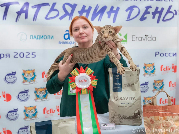 Кошка за 800 т.р. - золотая тикированная с разными глазами, без видимого белого (и то, и другое - большая редкость). Ее зовут Нефертити (Nefertiti Ermine Trace). Она взрослая, развязанная, ей 2 года 7 месяцев и у нее было аж целых два помета - 6 котят в сумме.