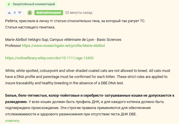 И еще, специально для тех, кто ищет мое имя "в списках генетиков России". Искать меня надо не там, а в статьях французского генетика Marie Abitbol, например "Different Founding Effects Underlie Dominant Blue Eyes (DBE) in the Domestic Cat", Animals 2024, 14(13), 01845. Вот в этом разделе: