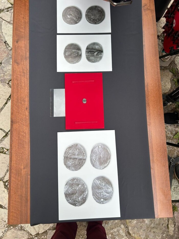 Печать поразительно точно, в мельчайших деталях следует иконографии знаменитой монеты «Ярославле сребро». На аверсе изображен святой Георгий Победоносец. На обороте отчеканена тамга Рюриковичей.