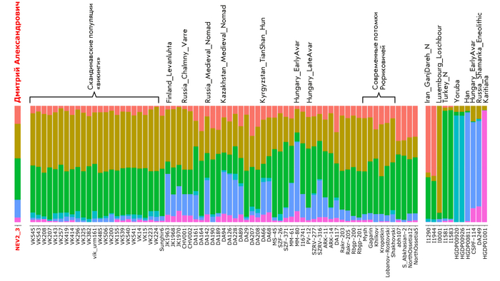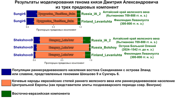 После анализа различных комбинаций предковых компонент наиболее подходящая модель указывает на вклад в происхождение князя Дмитрия Александровича трех компонент, как у следующих популяций: