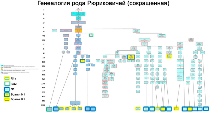 На основании результатов генетических исследований трех древних потомков Рюрика и предполагаемых 43 современных Рюриковичей выдвинуты гипотезы о трех возможных отцовских линиях Рюрика, а именно N1a, R1a и I2a.