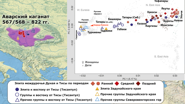 Как известно из работы 2022 года, популяции аварского периода демонстрируют значительную генетическую изменчивость, а их образцы разбросаны на графике анализа главных компонент от популяций Западной Евразии до популяций Северо-Восточной Азии.