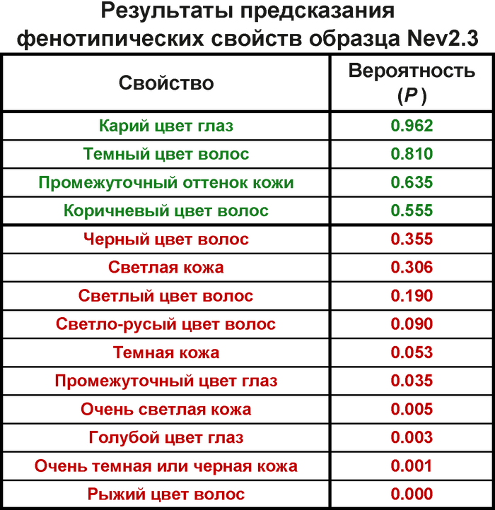 С большой вероятностью глаза князя Дмитрия Александровича были карими (P = 0.962), волосы темными (P = 0.810) или коричневыми (P = 0.555), а оттенок кожи промежуточным (0.635), т.е. не светлым и не темным.