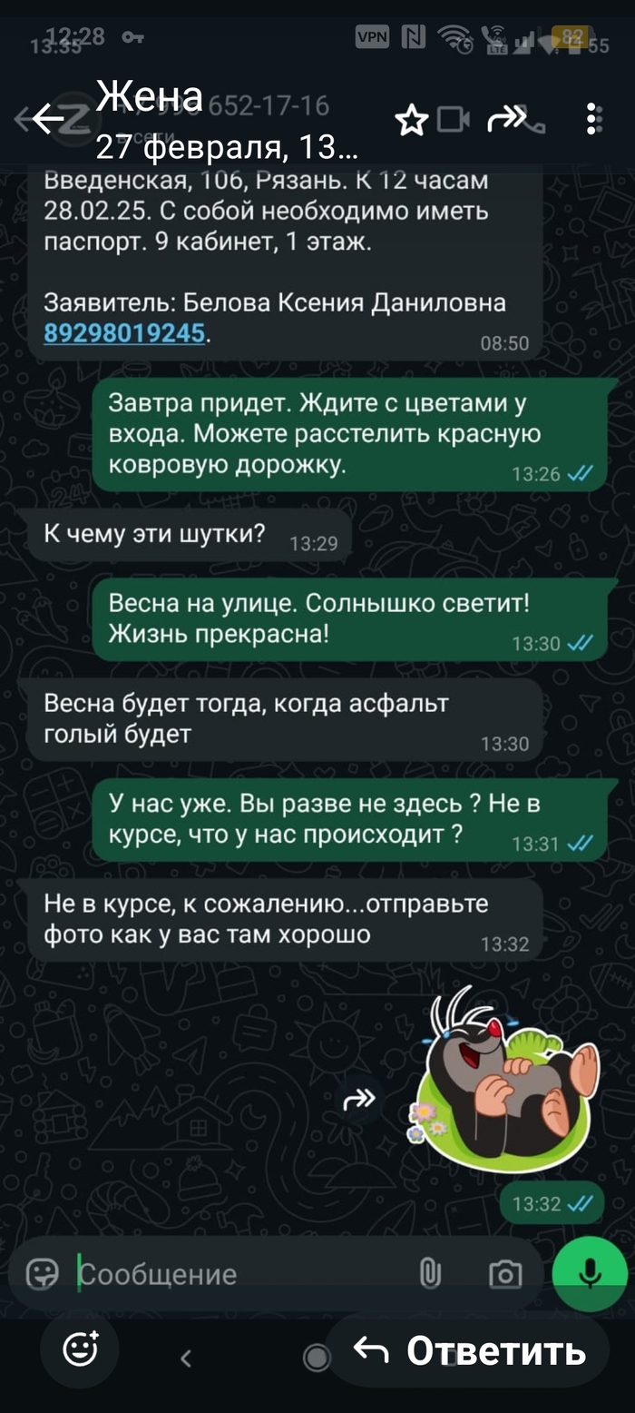Для лл: в ватцапе диалог с женой от якобы представителя полиции Рязани. На фоне усиленно работает "рация". На резонные вопросы стал потихоньку сдуваться. Признался, что не знает какая погода в Рязани и не в курсе, что уже растаял снег.