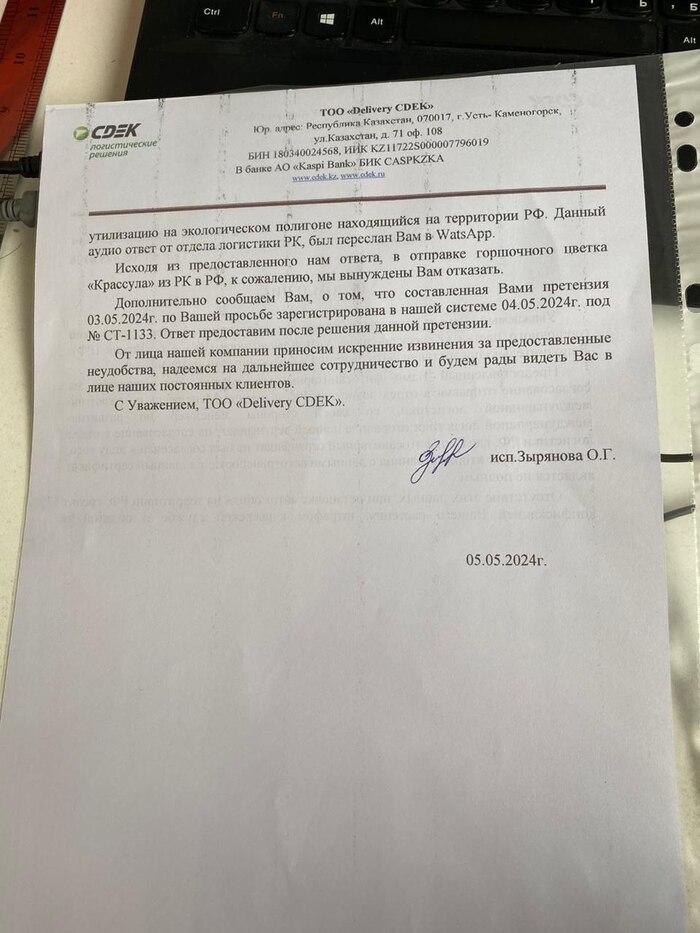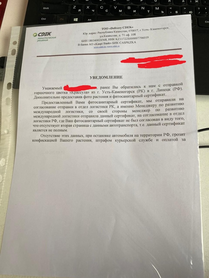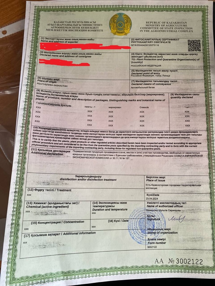И вот тут нам попадается компания @CDEK, которая очень уверенно сообщила мне что отвезет его куда нужно, только с необходимыми документами. (уверенно - это значит что я позвонил 4-5 разным операторам для подтверждения данной информации, по горячим линиям РК и РФ) и причем за очень приемлемую сумму ≈ 35к тенге. Сказано - сделано! Я подготовил все что от меня требовалось: а именно фитосанитарный сертификат и какую-то штуку, фото ниже: