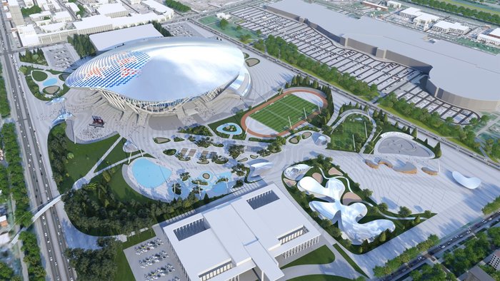Стадион на 23 206 зрителей поместят посреди парка площадью 3 гектара, где основные, прямые дорожки «по Лисицкому» будут сочетаться с сетью меньшего масштаба – уже криволинейной. Там запланированы различные спортивные поля, в том числе всепогодного использования, каток для холодного сезона, детская игровая площадка, скейт-парк, скалодром и т.п. От ветра посетителей защитят деревья.