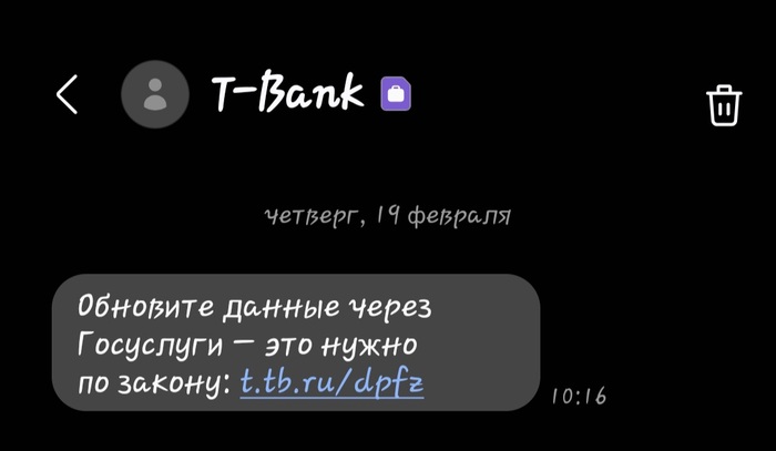 Сегодня утром получил смс такого вида. Перешёл по ссылке (тупанул, знаю), там открылось окошко госуслуг. Сайт нормальный, esia.gosuslugi.ru. Заполнять данные не стал, ибо нуегонафиг. У меня ни тинькова, ни т-банка отродясь не было. Есть симка т-мобайл, но требование-то пришло именно от банка, с которым у меня дел нет. @t-bank, вы рассылаете смски с требованием обновить данные? Или мошенники теперь и через смс работают?