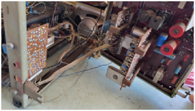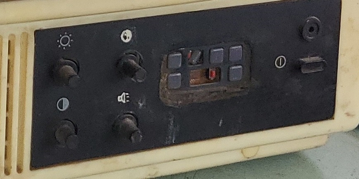 Даже виден штекер наушников, которого не было в мониторе. Так как шасси всё же от ТВ, то место для установки резисторов "Насыщенность" и "Громкость" было, осталось только вырезать на декоративной панели отверстие под них и нарисовать обозначение. В нашем городе, на тот момент, не вещало больше 6-ти каналов, поэтому СВП ставил на шесть каналов. Места для установки его в переднюю панель не было, мешал БП, поэтому установил его на заднюю панель, а на передней панели разместил только кнопки, которые просто дублировали СВП. Декорацию кнопок я взял от калькулятора Citizen, плата самодельная.