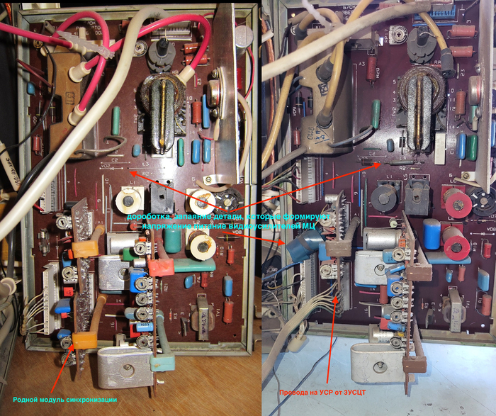 Сравнив схему субмодулей синхронизации, я выяснил в чём их сходство и различие. Разница оказалась по входу синхронизации: у 3УСЦТ был транзистор с фильтрующей цепочкой. Так как штекер-в штекер они не подходили, я напаял на УСР от 3УСЦТ на проводах и подключил штекер к штатному месту на плате развёрток. Подключил к видеосигналу и вот оно чудо: ЧБ изображение синхронизировано.