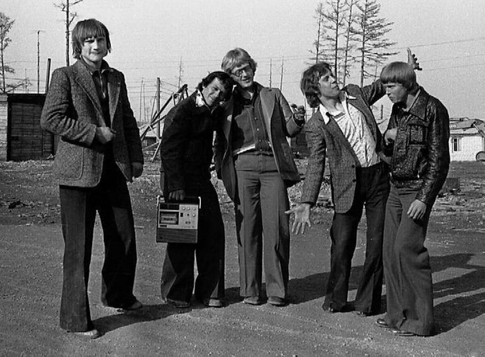 На фото же мы видим еще совсем другую моду. Трое парней лет 16-17-ти делают селфи в рубашках с огромными воротниками и в штанишках клеш и колокола. Видимо, собрались вечером на танцы в парк или дом культуры. На заднем фоне сидят бабули на лавочке и, глядя на парней, обсуждают их модный прикид. Затрудняюсь сказать, как в таких штанишках танцевали, да и просто ходили, потому что ширина калош достигала 30-40 сантиметров. Не знаю, где тогда такие продавали официально, скорее всего шили на заказ в ателье или у портних.