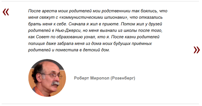 Кстати, Мортон Собелл, третий обвиняемый в деле Розенбергов, избежал смертного приговора, получив 30 лет тюремного заключения, из которых он отсидел около 18. Хотя, по мнению американских спецслужб, он передал СССР более 40 научно-исследовательских работ, имевших важное военно-техническое значение, а также первым передал информацию о том, что в США создана система управления ракетами, которые могут быть использованы как носители ядерных боезарядов.