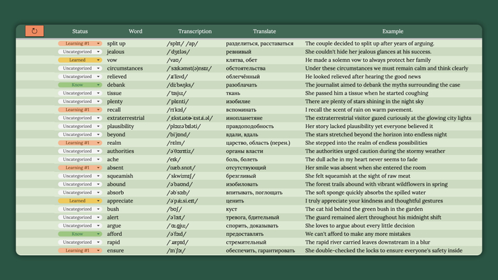 Эти же принципы я использовал, когда разрабатывал свою систему изучения слов. Уведомления в Telegram создают постепенность и постоянство, а полный доступ к уже выученным словам позволяет свободно повторять их в любой момент.